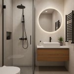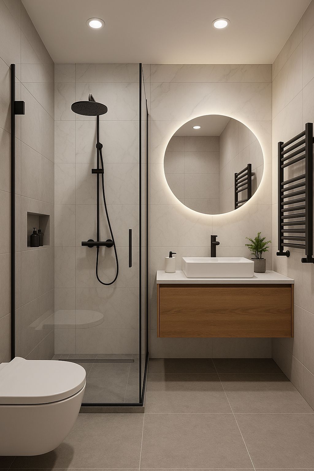 Bu banyo, İskandinav sıcaklığı ile modern geometrik netlik arasında mükemmel bir denge kuruyor.Formlar düz, renkler doğal, detaylar işlevsel — hiçbir şey fazla değil ama her şey yerli yerinde.