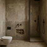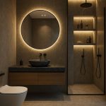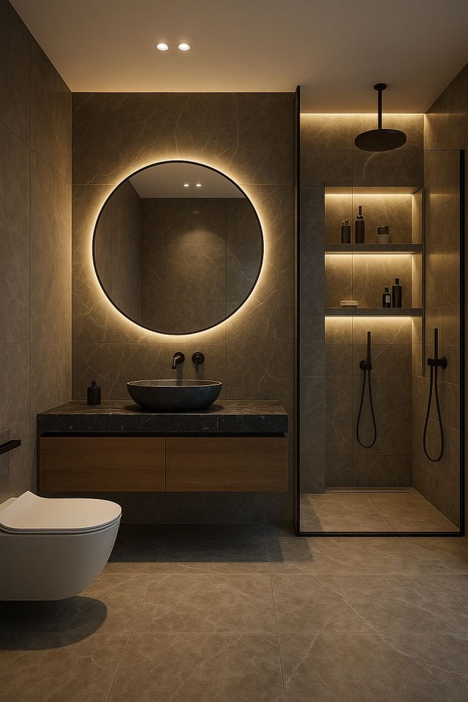 Bu banyo tasarımı, sade geometrik formlar, gizli aydınlatma ve doğal malzeme dokularıyla “az ama etkili” felsefesini yansıtıyor.